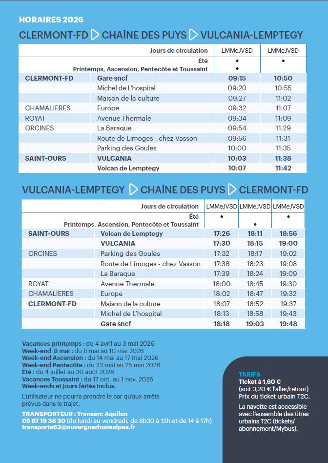 Le SMTC relance en 2026 la navette entre Clermont-Ferrand, la Chaîne des Puys, Vulcania et le Volcan de Lemptégy. Cette navette saisonnière facilite l’accès à ces sites touristiques majeurs tout en proposant une alternative pratique à la voiture.
